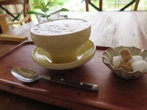 カフェラテ、大きなカップにたっぷり!飲み物は数種類あり、おすすめは酵素ジュースや、大磯ブレンド、他にアルコール類やパフェ、ケーキもあります。