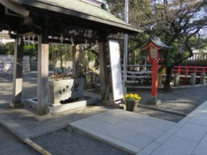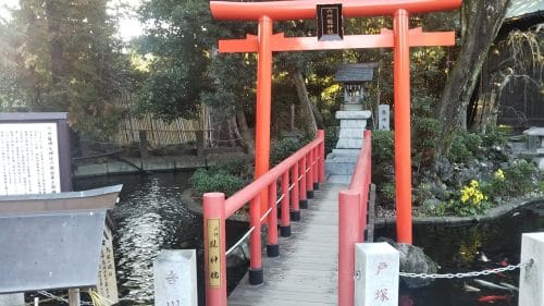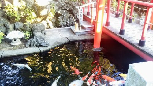 また反対側にはひぐるま弁天社、千万池には色鮮やかな錦鯉が泳いています。水みくじもあります。